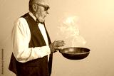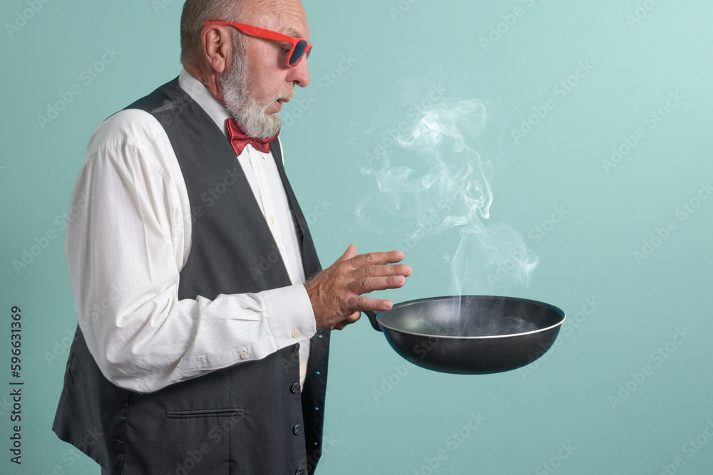 Kitchen control. Festive fuss. A man with a smoking frying pan in his hand. On a light green background