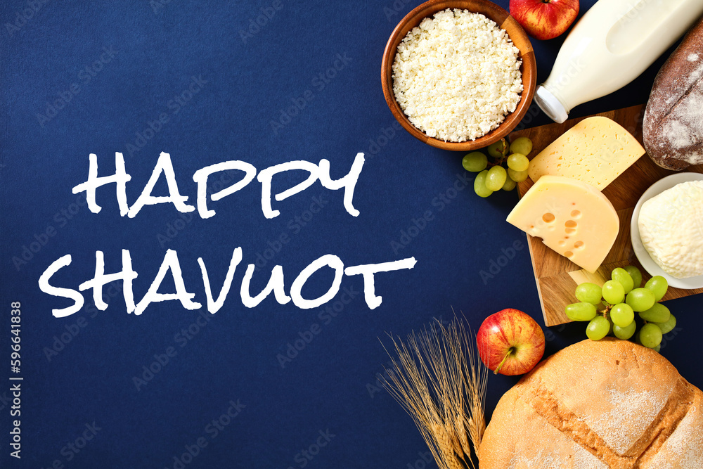 Happy Shavuot concept. Greeting card for Jewish holiday Shavuot. Flat lay cottage cheese, bottle of milk, cereal bread, grape, apples, wheat and sign Happy Shavuot