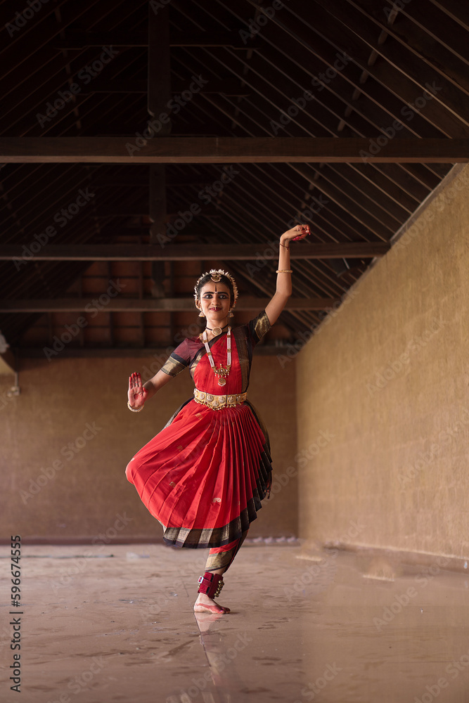 Indian Bharatanatyam dancer performing various steps wearing red saree.