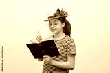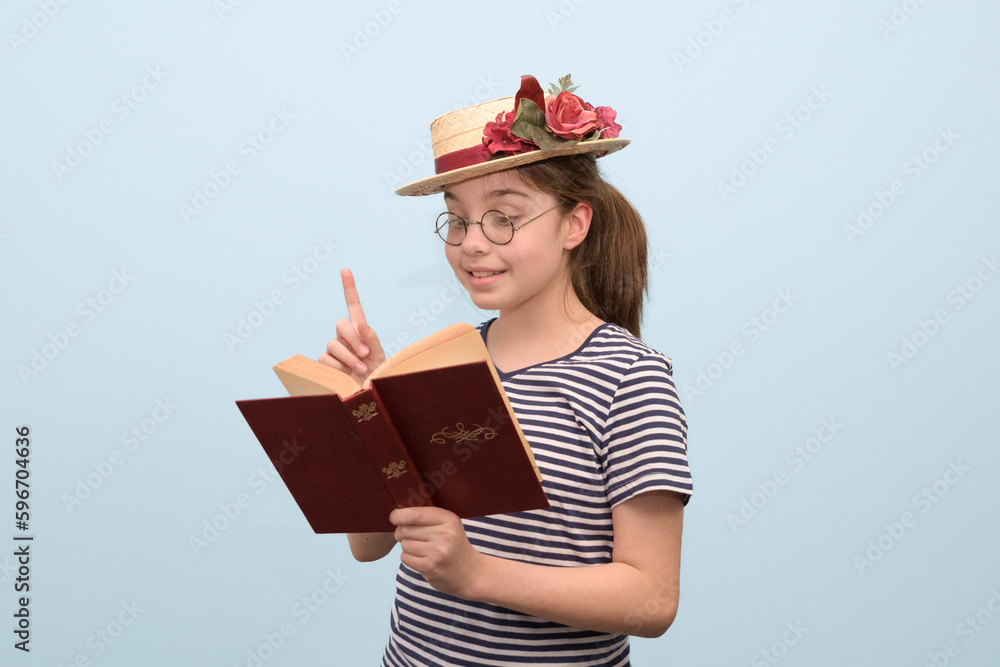 A girl in retro style clothes enthusiastically reads a book a straw hat with flowers, glasses and a book in her hand.