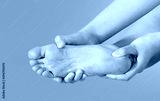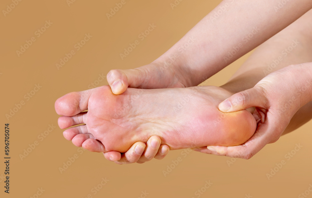 Woman with severe plantar pain is massaging her foot, isolated on beige background