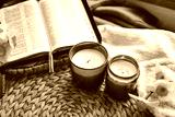 Open Bible with flowers and candles in a cozy home interior. Christian beautiful morning photography.