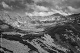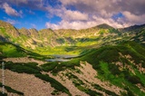 Lake in mountains in summer morning scenery. Picturesque view stretches over lakes in the Five Pond Valley and mountain ridge in Tatra Mountains, Poland.