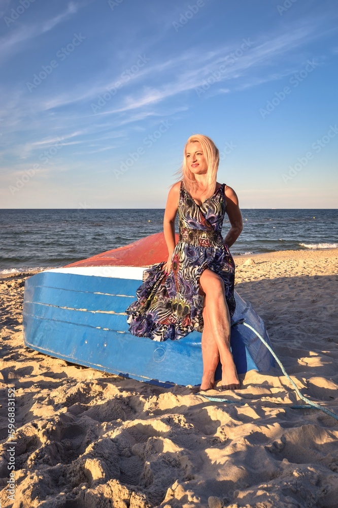 Beautiful holiday concept with a woman on the beach. Girl on a boat in Jastarnia, Poland.