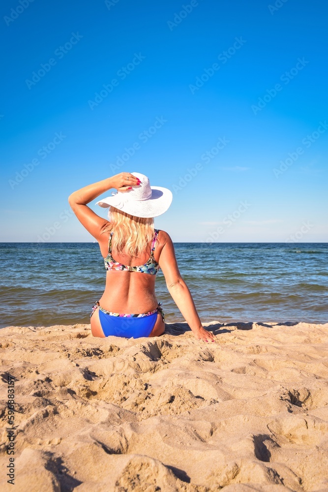 Beautiful holiday sunny concept with a woman by the sea. Blond-haired girl on the beach in Jastarnia, Poland.