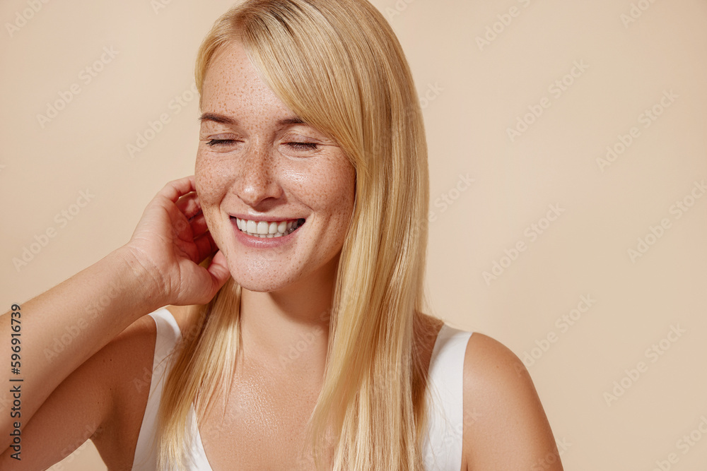 Cheerful woman with closed eyes adjusting her blond hair. Happy female with freckles against a pastel backdrop.