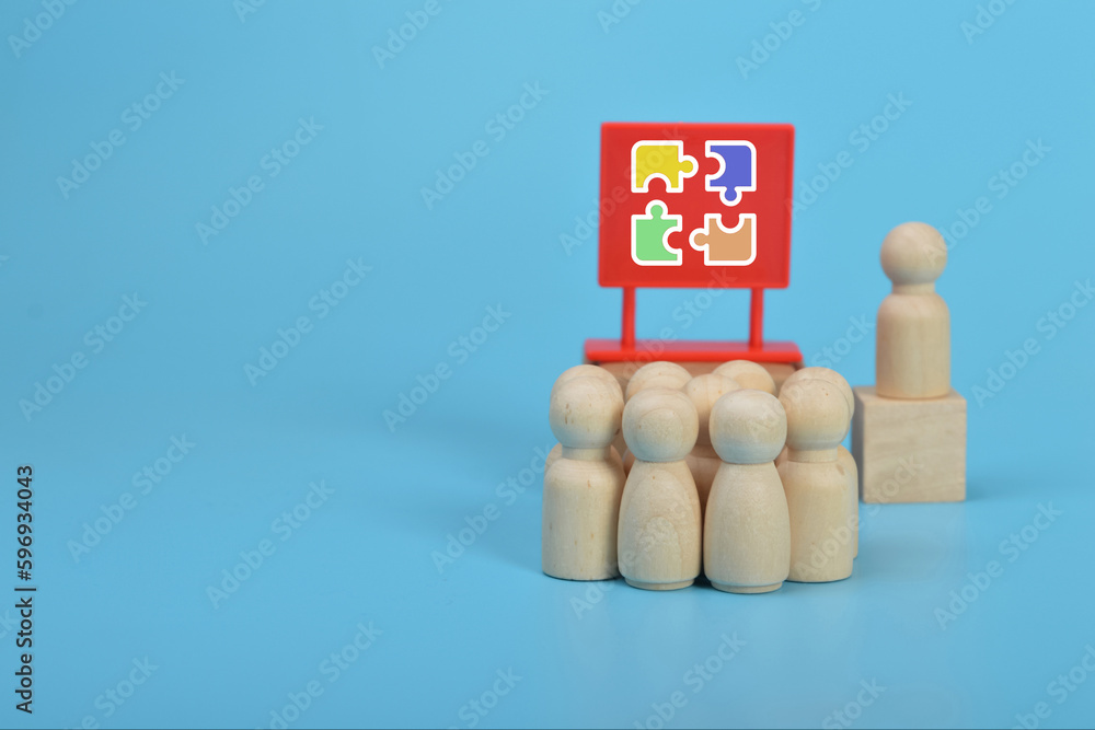 An assembly of businessmen featuring jigsaw puzzle symbols, embodying the value of collaboration and teamwork in achieving organizational goals and objectives.