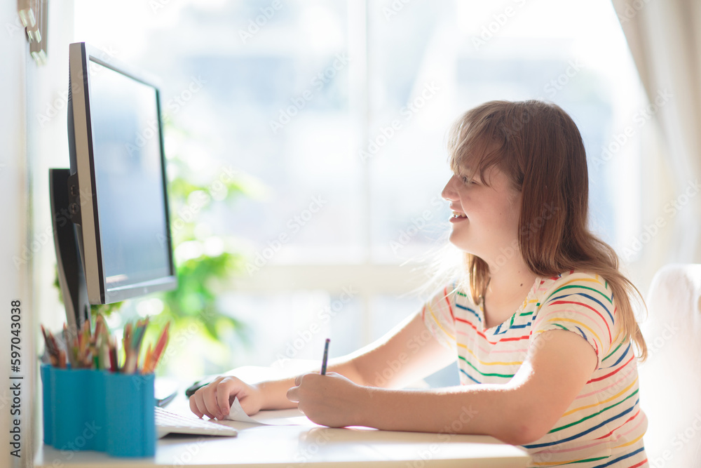 Child doing homework on computer. Online class.