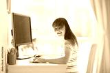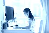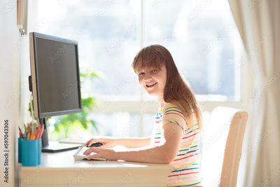 Child doing homework on computer. Online class.