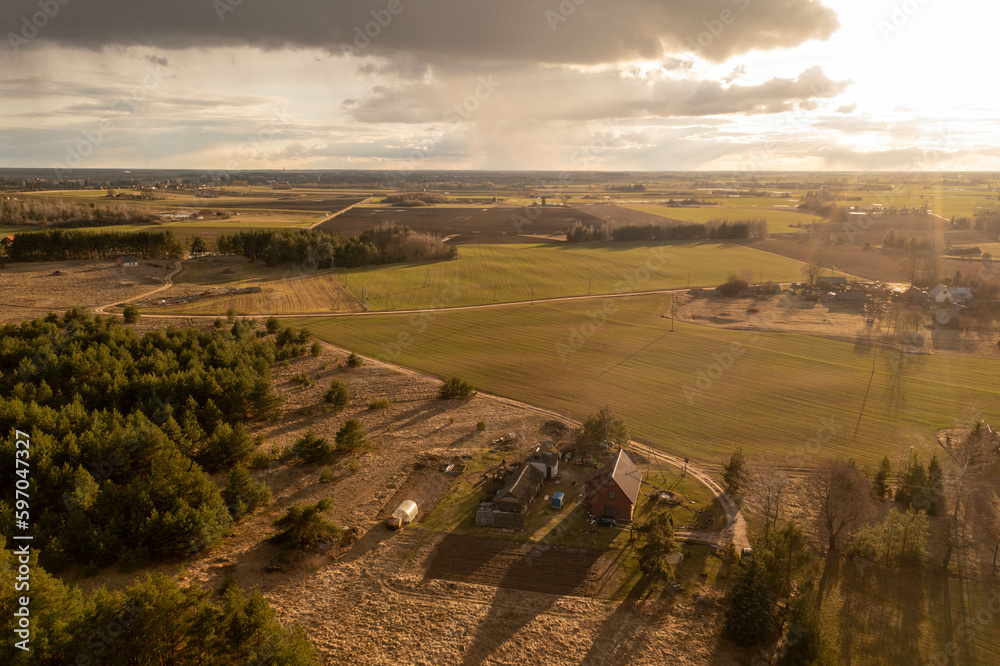Drone photography of forest, agriculture fields, old farms, meadows, rural landscape
