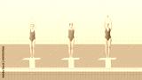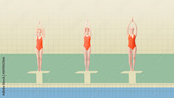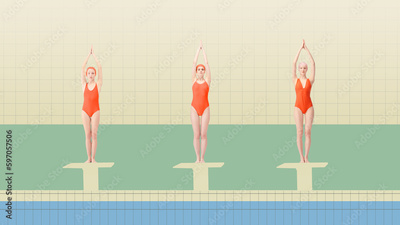 Young girls, swimming athletes in red swimsuits standing on starting blocks, ready to jump into pool and swim. Contemporary art collage. Concept of sport, retro style, creativity, fashion, activity.