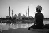 travel to the United Arab Emirates, Happy young asian female traveler with backpack and hat in Wahat Al Karama or Oasis of Dignity, permanent memorial for its martyrs, and Shaikh Zayed Grand Mosque.