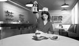 Composite image with young woman, waitress in 70s retro fashion uniform sitting at table with coffee on 3D model of diner interior, restaurant