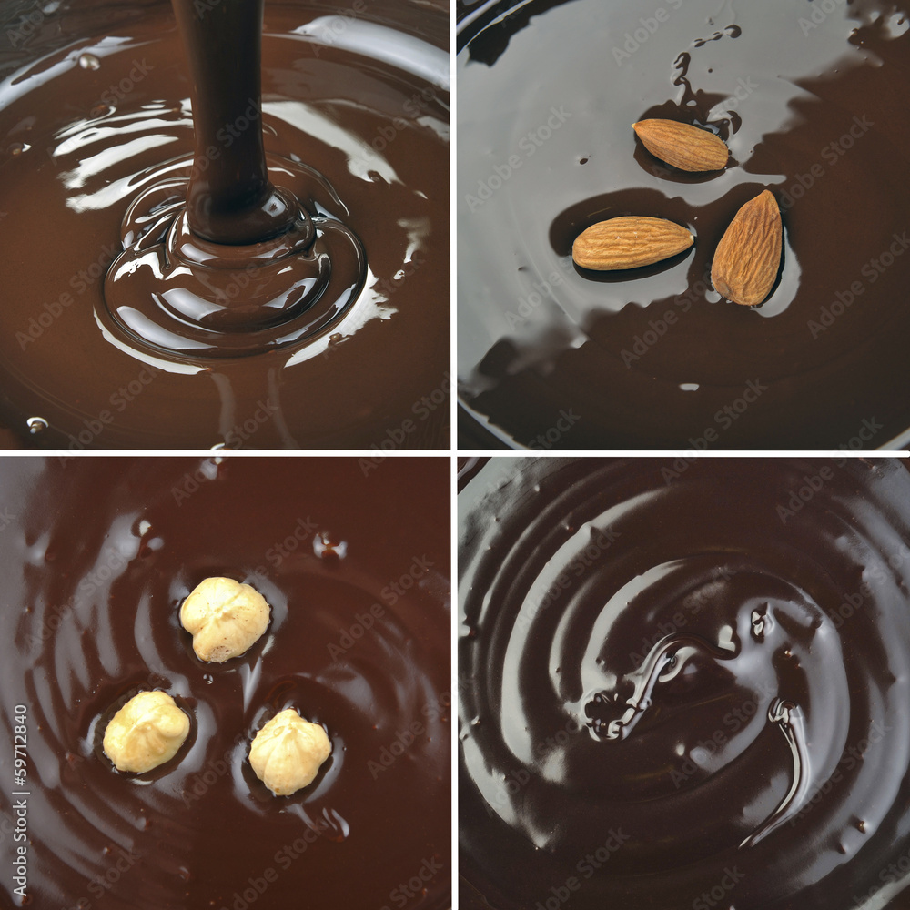 set of images with pouring chocolate and nuts