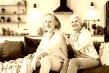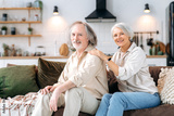 Photo of a happy pensioners. Mature caucasian married couple, spend time together in living room at home, wife and husband sit on a sofa, wife massaging her husband's shoulders, they smile at camera