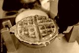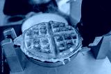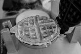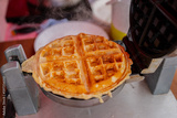 Freshly cooked brown waffle in waffle pan with steam coming off it