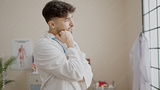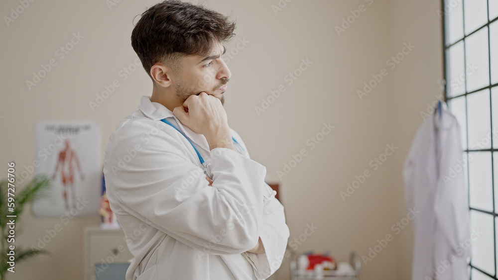 Young arab man doctor standing with arms crossed gesture and relaxed expression at clinic