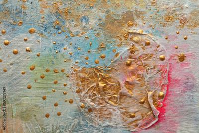 Art modern oil and acrylic smear blot canvas painting wall. Abstract texture gold, beige and blue color stain brushstroke texture background.