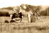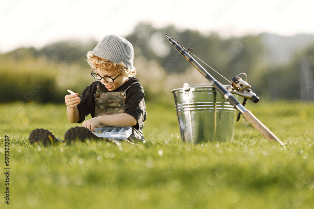 Blonde curly boy sitting on a grass and holding a box with a baits for fish