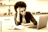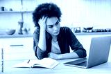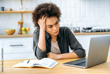 Frustrated african american curly young woman, student or freelancer, sit in a kitchen at a table with a laptop, disappointment look at screen, tired of studying or working online, having a headache