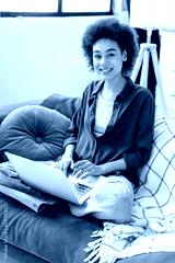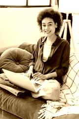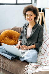 Vertical photo of gorgeous happy young african american woman, student, freelancer, programmer, sits on a sofa in living room with a laptop, working online, looks at camera, smiles friendly