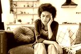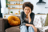 Unhappy frustrated african american curly young woman in casual clothes, sitting on the sofa in the living room with her eyes closed leaning on her hand, having a headache, personal problems, anxiety