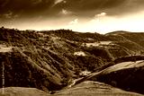 Hills and mountains covered with young green grass and illuminated by the sun on a sunny day.
