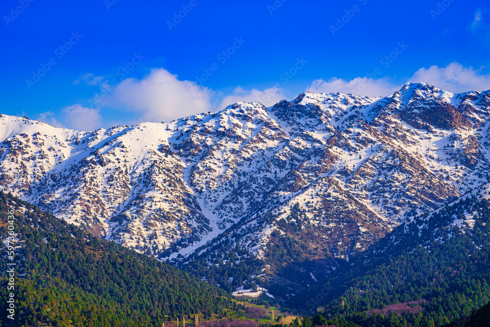 Mountain top covered with young snow and illuminated by the sun on a sunny day. Mountain landscape.