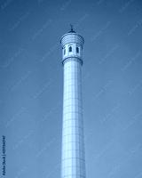 The minaret of the Minor Mosque is made of white marble against a twilight sky.