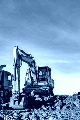 A wheeled excavator loads a dump truck with soil and sand. An excavator with a high-raised bucket against a cloudy sky View from the trench. Removal of soil from a construction site or quarry.