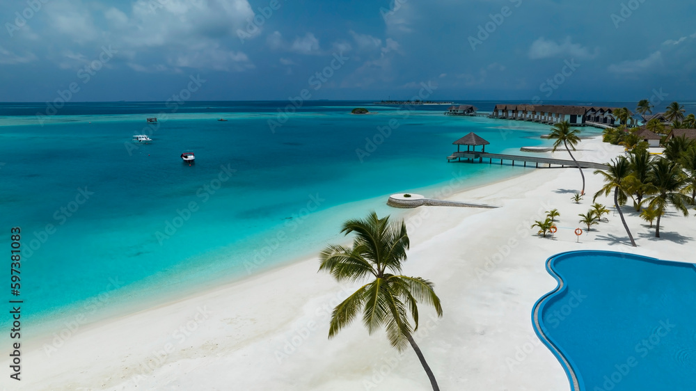 Summer on the sandy beach and turquoise Tropical beach with maldives paradise scenery seascape with water villas as amazing sea and lagoon beach, Exotic tourism