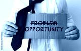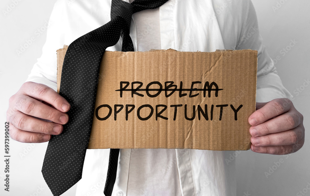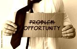 A disheveled business man holds up a cardboard sign with the words Problem Opportunity