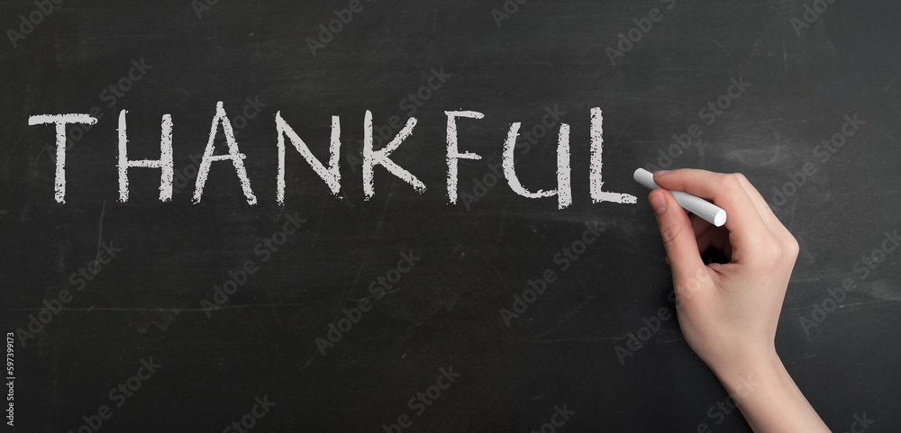A woman's hand write text Thankful with chalk on chalkboard