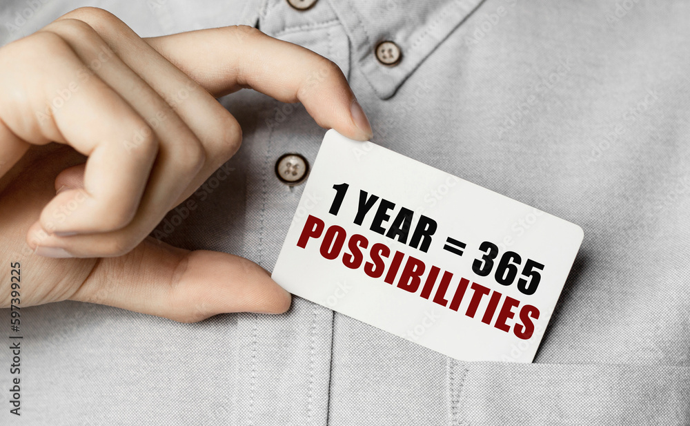 Man putting a card with text 1 Year 365 Possibilities in the pocket