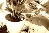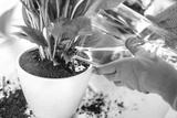 Closeup of Female gardener hands watering plant, white peace lily, spathiphyllum houseplant. Caring of home green plants indoors, spring waking up, home garden. Spring work room care, gardening blog.