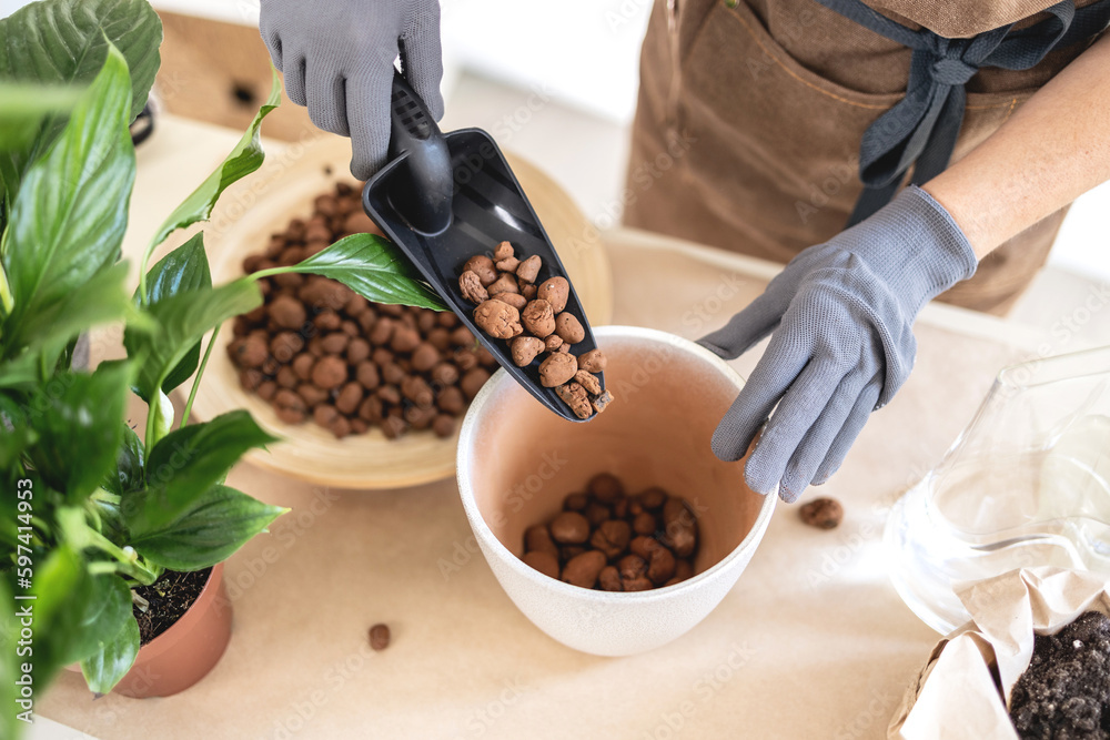 Closeup of Female gardener hands adding Hydroponic Clay Pebbles in pot for transplanting houseplant. Caring of home green plants indoors, spring waking up, home garden blog, how to repotting tutorial