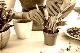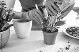 Closeup of woman gardener hands removes white peace lily, spathiphyllum houseplant from flowerpot with garden trowel. Caring of home green plants indoors, spring waking up, home garden, gardening blog