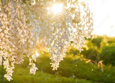 藤岡ふじまつりの夕日に照らされた白い藤の花