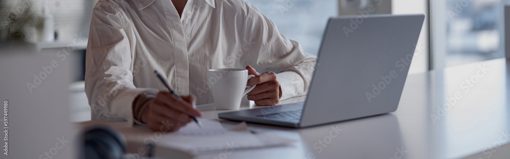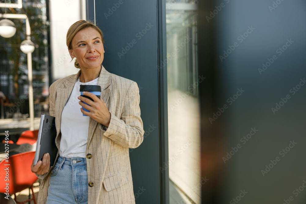 Charming businesswoman working at the office using a laptop looking away. Blurred background