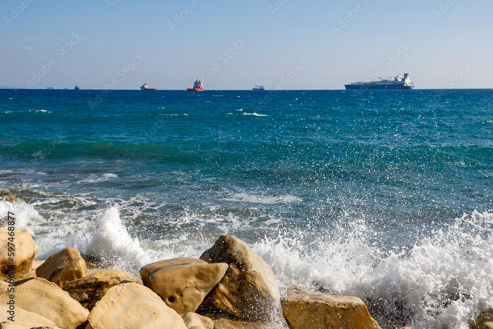 Foamy waves splashing at rocky coastline in Limassol, Cyprus