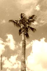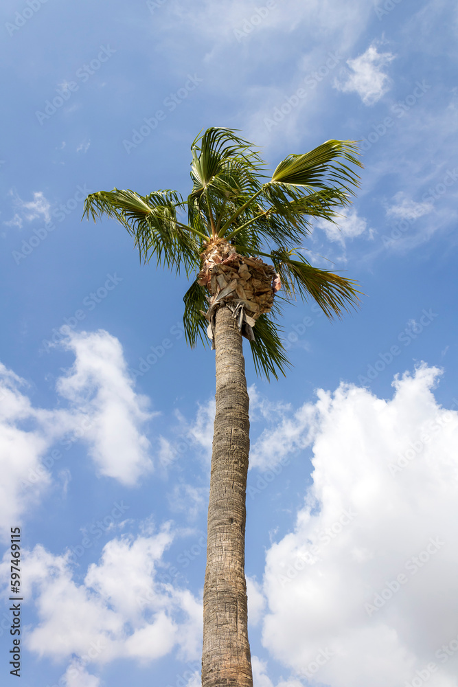 Tall palm tree in front of blue sky and white clouds in the wind