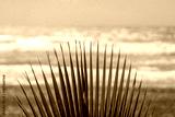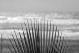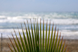 Green palm leaves with dry ends in front of srormy sea and gray sky