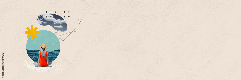 Dreams and relaxation. Young girl in red swimsuit and straw hat sitting near sea on sunny day. Contemporary art collage. Concept of summertime holidays, inspiration, travel. Banner. Copy space for ad