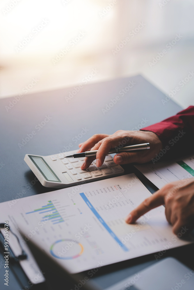 Portrait of man working on tablet computer in modern office make account analysis report Real estate investment information, financial and tax system concept