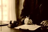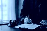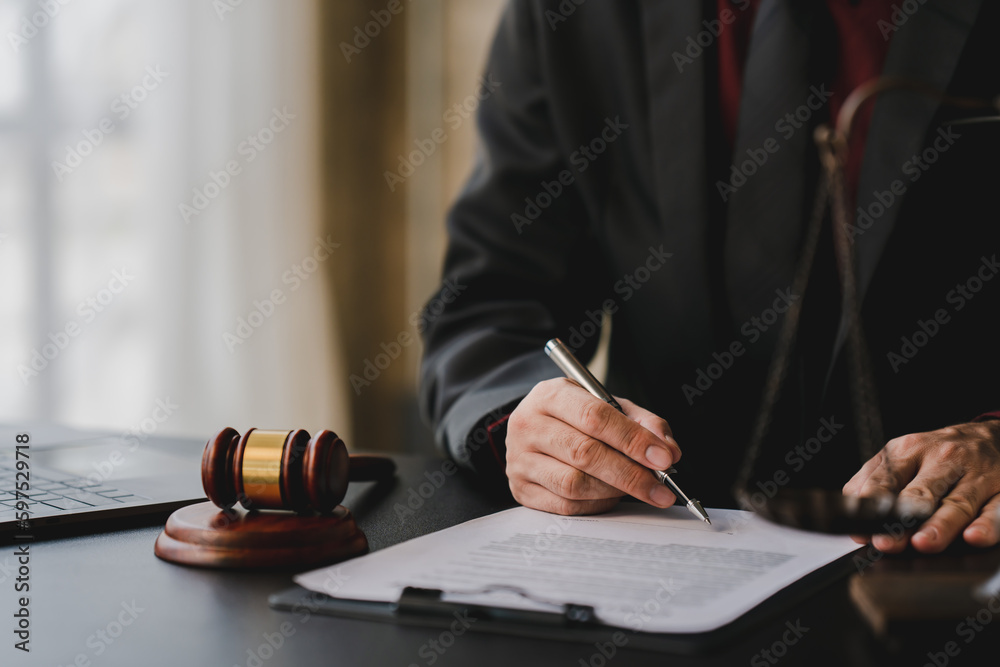 concept of justice and law A male judge in the courtroom on a wooden table and a male counselor or lawyer working in the office. Law, advice and justice concepts..