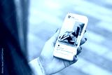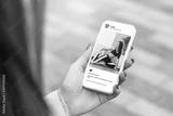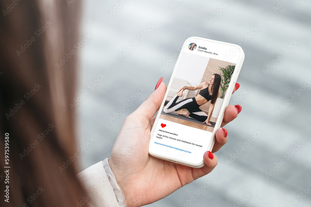 Woman looking at beautiful model's photo doing yoga on mobile phone