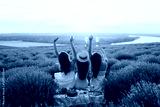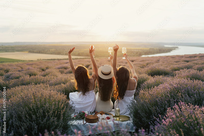 Back view of company of young female friends having fun, drink wine, and enjoy beautiful landscape and sunset at summer picnic.