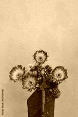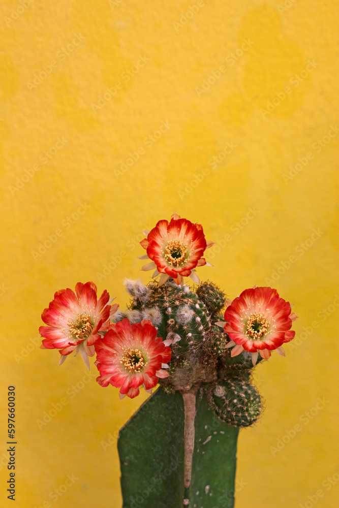 A large flowering cactus in bloom with red flowers isolated against a blank bright yellow wall