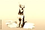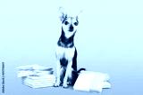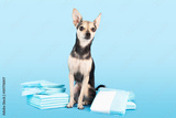dog nappy, small dog with absorbent diaper pad, urine diaper pet napkin on blue background