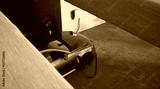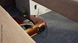 High angle Generic electric vehicle EV hybrid car is being charged from a wallbox on a contemporary modern residential building house